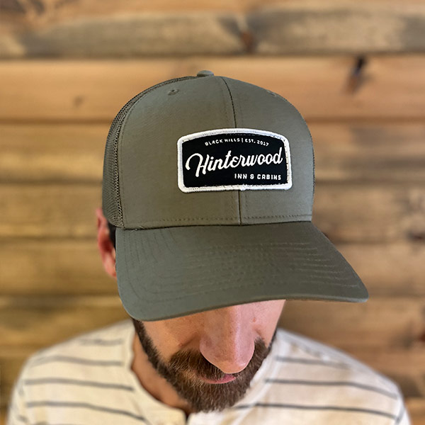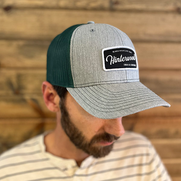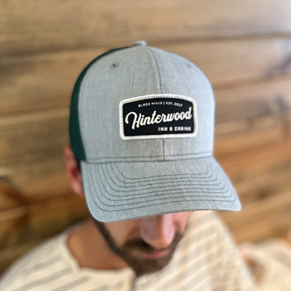 This Heather Grey Hinterwood Hat is a pre-curved, six-panel hat. The hat is fully adjustable and constructed of cotton with a Hinterwood Inn & Cabins patch, complete with polyester mesh back.